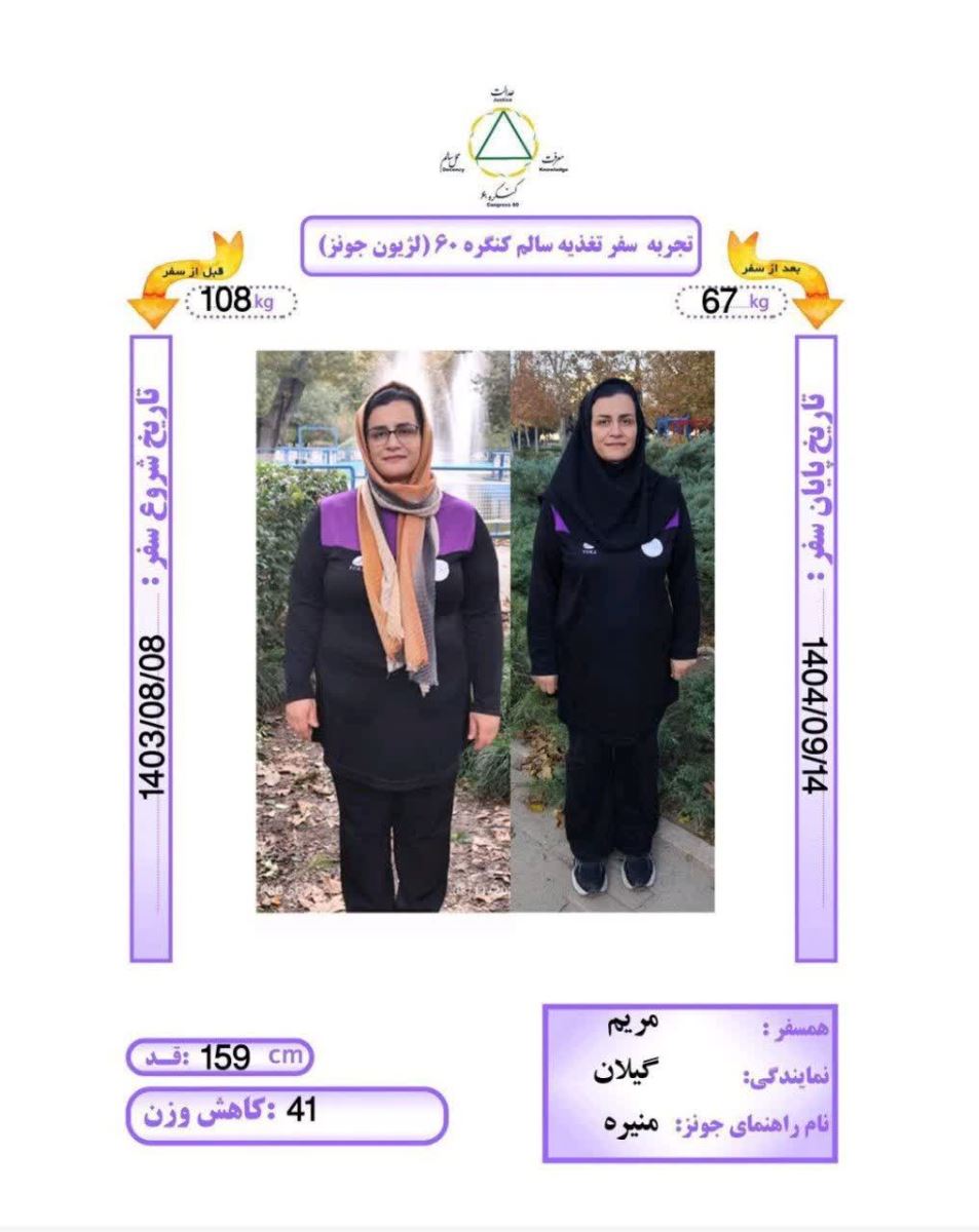 در روز جمعه ۱۴ آذرماه ۱۴۰۴ همسفر مریم رهجوی راهنما همسفر منیره از نمایندگی گیلان با قد ۱۵۹ و وزن اولیه ۱۰۸ کیلوگرم به مدت ۱۳ ماه و 6 روز به روش Dezhakam سفر کردند؛ ۴۱ کیلوگرم کاهش وزن داشتند و به وزن ۶۷ کیلوگرم رسیدند و با دستان پر مهر آقای مهندس آزاد و رها شدند.