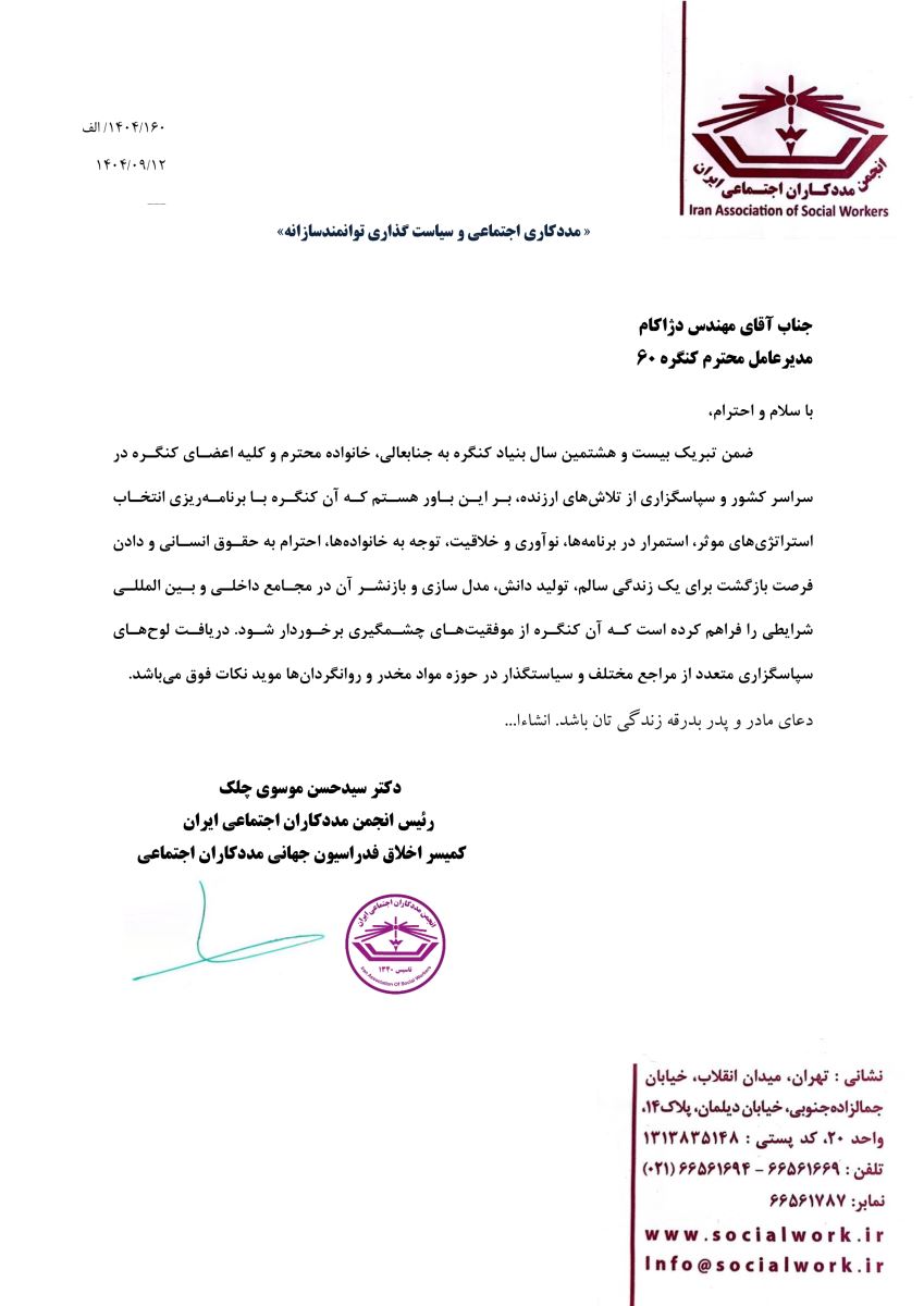 اخبار داخلی پیام تبریک دکتر موسوی چلک، رئیس انجمن مددکاران اجتماعی ایران منبع: نمایندگی پروین اعتصامی شنبه 15 آذر 1404 تعداد بازدید از این مطلب : 85 «روابط عمومی کنگره۶۰ نمایندگی پرویناعتصامی اراک» منبع: نمایندگی پروین اعتصامی شنبه 15 آذر 1404 تعداد بازدید از این مطلب : 85 ویژه ها هشدار نایدا: وقفه در بروزرسانی و ارائه برخی از خدمات به دلیل وقفه در تأمین بودجۀ دولتی امریکا پذیرش مقاله مهندس حسین دژاکام برای ارائه در کنفرانس "مراقبت از اعصاب"،شیکاگو، امریکا (2026) گامی سرنوشتساز از سوی مهندس حسین دژاکام در درمان کووید-۱۹ و سارس ارائه مقاله جدید و برجسته مهندس حسین دژاکام در حوزه درمان اعتیاد با روش DST با دقت سلولی مولکولی در کنفرانس بین المللی درمان اعتیاد در اورلاندو، فلوری مقاله "تأثیرات رفتاری و مولکولی پروتکل دی اس تی بر مدل حیوانی اعتیاد به تریاک" از مهندس حسین دژاکام، درصدر محافل علمی دنیا مورد بررسی و پذیرش قرار گر دستاورد شگفتآور دیگری از تیم تحقیقاتی کنگره 60 در ریسرچ گیت منتشر گردید. دستاورد شگفت آور دیگری از کنگره 60، انتشار مقاله مهار متاستاز سرطان سینه به صورت short communication رویکردی نوین در درمان سرطان