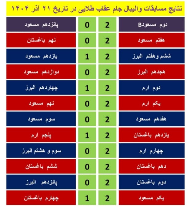 اخبار داخلی نتــایــج و برنامه مسابقـــات والیــبال جام عقـــاب طلایــی منبع: پارک چمران (کرج) يکشنبه 23 آذر 1404 تعداد بازدید از این مطلب : 61 "بــه نام قـــدرت مطلق الله" نتایج مسابقات برگزار شده در روز جمعه بیست و یکم آذر ماه ۱۴۰۴ برنامه دور جدید مسابقات: تیـــمهای اول و دوم، صعــودکننده به مرحلــه بعــد: منبع: پارک چمران (کرج) يکشنبه 23 آذر 1404 تعداد بازدید از این مطلب : 61 ویژه ها هشدار نایدا: وقفه در بروزرسانی و ارائه برخی از خدمات به دلیل وقفه در تأمین بودجۀ دولتی امریکا پذیرش مقاله مهندس حسین دژاکام برای ارائه در کنفرانس "مراقبت از اعصاب"،شیکاگو، امریکا (2026) گامی سرنوشتساز از سوی مهندس حسین دژاکام در درمان کووید-۱۹ و سارس مقاله "تأثیرات رفتاری و مولکولی پروتکل دی اس تی بر مدل حیوانی اعتیاد به تریاک" از مهندس حسین دژاکام، درصدر محافل علمی دنیا مورد بررسی و پذیرش قرار گر ارائه مقاله جدید و برجسته مهندس حسین دژاکام در حوزه درمان اعتیاد با روش DST با دقت سلولی مولکولی در کنفرانس بین المللی درمان اعتیاد در اورلاندو، فلوری دستاورد شگفتآور دیگری از تیم تحقیقاتی کنگره 60 در ریسرچ گیت منتشر گردید. دستاورد شگفت آور دیگری از کنگره 60، انتشار مقاله مهار متاستاز سرطان سینه به صورت short communication رویکردی نوین در درمان سرطان