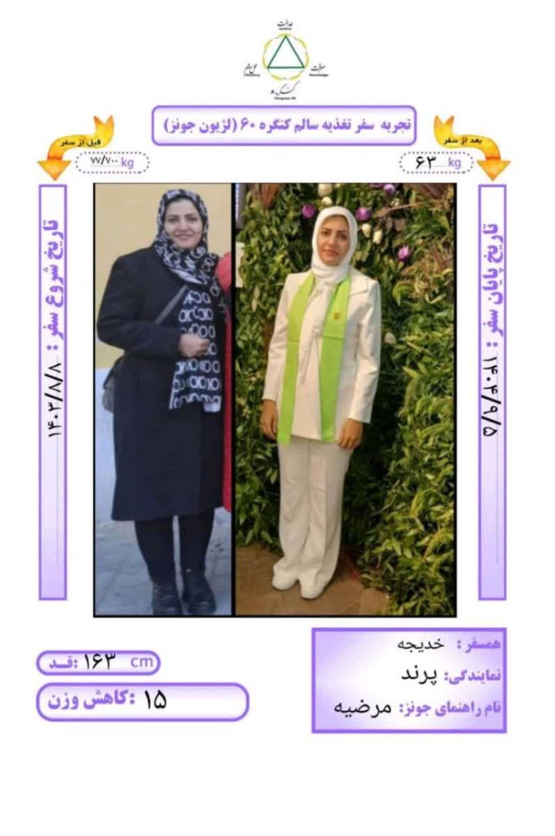 در روز چهارشنبه 5 آذر ماه ۱۴۰۴، همسفر خدیجه راهنما همسفر مرضیه از نمایندگی پرند با قد ۱۶۳ سانتیمتر و وزن اول 77/700 کیلوگرم به مدت 12 ماه و 27 روز به روش Dezhakam سفر کردند؛ ۱۵ کیلوگرم کاهش وزن داشتند و به وزن ۶۳ کیلوگرم رسیدند و با دستان پر مهر آقای مهندس آزاد و رها شدند.
