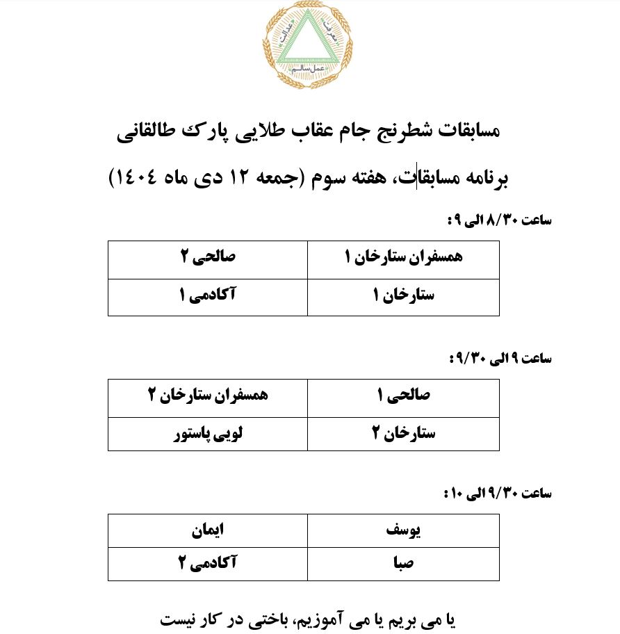 تربیت بدنی برنامه هفته سوم مسابقات شطرنج جام عقاب طلایی طالقانی (جمعه 12 دی ۱۴۰۴) منبع: پارک طالقانی(تهران) پنج شنبه 11 دي 1404 تعداد بازدید از این مطلب : 80 به نام قدرت مطلق الله؛ برنامه هفته دوم مسابقات جام عقاب طلایی به شرح زیر میباشد: در ادامه شاهد تصاویری از برگزاری مسابقات در هفته اول خواهید بود: نگهبان شطرنج پارک طالقانی: مسافر حسن دبیر شطرنج پارک طالقانی: مسافر حامد منبع: پارک طالقانی(تهران) پنج شنبه 11 دي 1404 تعداد بازدید از این مطلب : 80 ویژه ها هشدار نایدا: وقفه در بروزرسانی و ارائه برخی از خدمات به دلیل وقفه در تأمین بودجۀ دولتی امریکا پذیرش مقاله مهندس حسین دژاکام برای ارائه در کنفرانس "مراقبت از اعصاب"،شیکاگو، امریکا (2026) گامی سرنوشتساز از سوی مهندس حسین دژاکام در درمان کووید-۱۹ و سارس مقاله "تأثیرات رفتاری و مولکولی پروتکل دی اس تی بر مدل حیوانی اعتیاد به تریاک" از مهندس حسین دژاکام، درصدر محافل علمی دنیا مورد بررسی و پذیرش قرار گر ارائه مقاله جدید و برجسته مهندس حسین دژاکام در حوزه درمان اعتیاد با روش DST با دقت سلولی مولکولی در کنفرانس بین المللی درمان اعتیاد در اورلاندو، فلوری دستاورد شگفتآور دیگری از تیم تحقیقاتی کنگره 60 در ریسرچ گیت منتشر گردید. دستاورد شگفت آور دیگری از کنگره 60، انتشار مقاله مهار متاستاز سرطان سینه به صورت short communication رویکردی نوین در درمان سرطان
