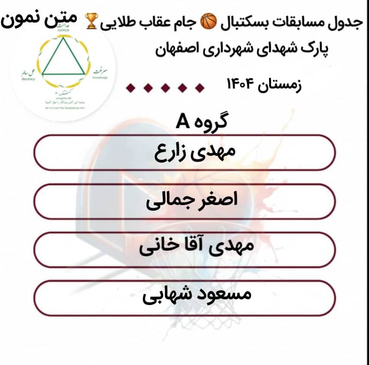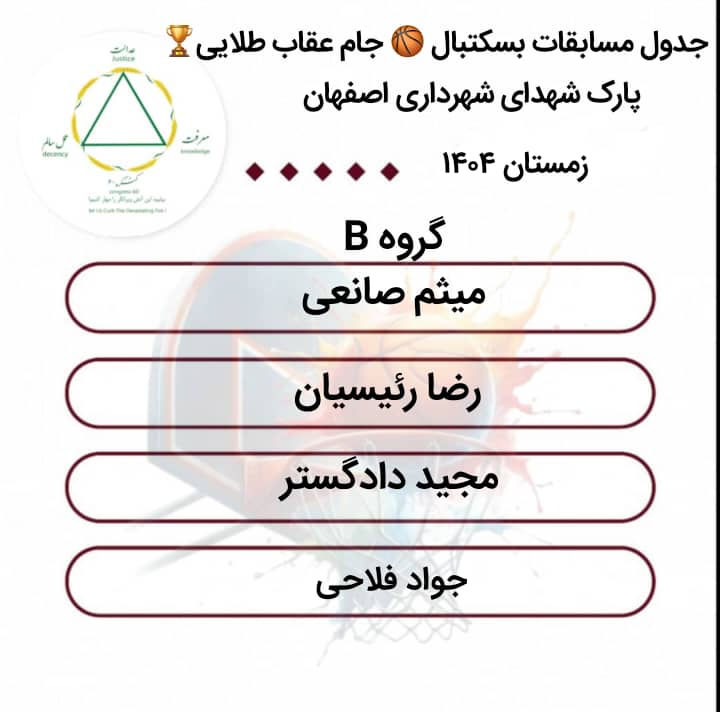 تربیت بدنی جدول مسابقات بسکتبال جام عقاب طلایی منبع: پارک شهدای شهرداری (اصفهان) سه شنبه 16 دي 1404 تعداد بازدید از این مطلب : 78 گروه A گروه B ارسال مطلب : مسافر امیرحسین منبع: پارک شهدای شهرداری (اصفهان) سه شنبه 16 دي 1404 تعداد بازدید از این مطلب : 78 ویژه ها هشدار نایدا: وقفه در بروزرسانی و ارائه برخی از خدمات به دلیل وقفه در تأمین بودجۀ دولتی امریکا پذیرش مقاله مهندس حسین دژاکام برای ارائه در کنفرانس "مراقبت از اعصاب"،شیکاگو، امریکا (2026) گامی سرنوشتساز از سوی مهندس حسین دژاکام در درمان کووید-۱۹ و سارس ارائه مقاله جدید و برجسته مهندس حسین دژاکام در حوزه درمان اعتیاد با روش DST با دقت سلولی مولکولی در کنفرانس بین المللی درمان اعتیاد در اورلاندو، فلوری مقاله "تأثیرات رفتاری و مولکولی پروتکل دی اس تی بر مدل حیوانی اعتیاد به تریاک" از مهندس حسین دژاکام، درصدر محافل علمی دنیا مورد بررسی و پذیرش قرار گر دستاورد شگفتآور دیگری از تیم تحقیقاتی کنگره 60 در ریسرچ گیت منتشر گردید. دستاورد شگفت آور دیگری از کنگره 60، انتشار مقاله مهار متاستاز سرطان سینه به صورت short communication رویکردی نوین در درمان سرطان