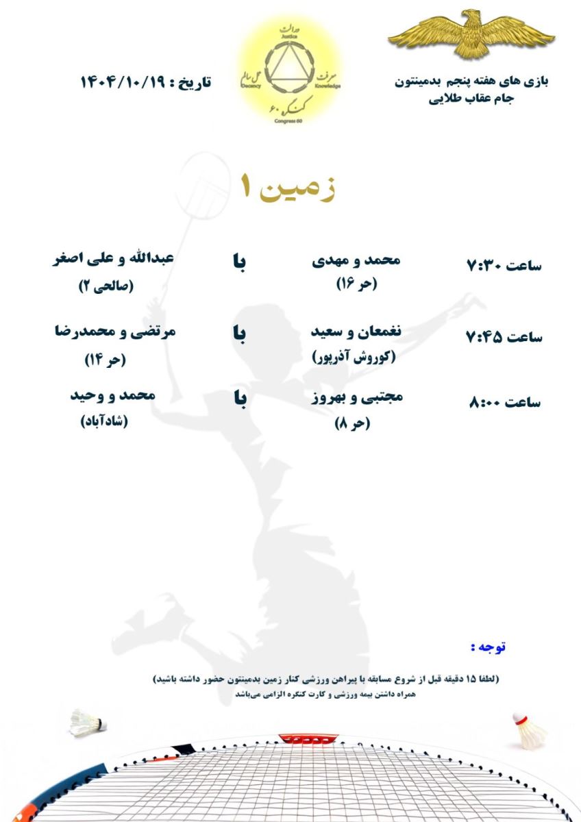 تربیت بدنی برنامه مسابقات بدمینتون جام عقاب طلایی کنگره ۶۰ در بوستان ولایت منبع: پارک ولایت (تهران) سه شنبه 16 دي 1404 تعداد بازدید از این مطلب : 95 برنامه مسابقات بدمینتون جام عقاب طلایی کنگره ۶۰ در بوستان ولایت مورخ 1404/10/19 بار گذاری : مرزبان خبری (مسافر رحمان) منبع: پارک ولایت (تهران) سه شنبه 16 دي 1404 تعداد بازدید از این مطلب : 95 ویژه ها هشدار نایدا: وقفه در بروزرسانی و ارائه برخی از خدمات به دلیل وقفه در تأمین بودجۀ دولتی امریکا پذیرش مقاله مهندس حسین دژاکام برای ارائه در کنفرانس "مراقبت از اعصاب"،شیکاگو، امریکا (2026) گامی سرنوشتساز از سوی مهندس حسین دژاکام در درمان کووید-۱۹ و سارس ارائه مقاله جدید و برجسته مهندس حسین دژاکام در حوزه درمان اعتیاد با روش DST با دقت سلولی مولکولی در کنفرانس بین المللی درمان اعتیاد در اورلاندو، فلوری مقاله "تأثیرات رفتاری و مولکولی پروتکل دی اس تی بر مدل حیوانی اعتیاد به تریاک" از مهندس حسین دژاکام، درصدر محافل علمی دنیا مورد بررسی و پذیرش قرار گر دستاورد شگفتآور دیگری از تیم تحقیقاتی کنگره 60 در ریسرچ گیت منتشر گردید. دستاورد شگفت آور دیگری از کنگره 60، انتشار مقاله مهار متاستاز سرطان سینه به صورت short communication رویکردی نوین در درمان سرطان