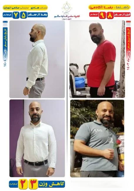 کاهش و افزایش وزن برگزاری لژیون تغذیه به روش دژاکام(لژیون جونز) نمایندگی پارک طالقانی 6 دي 23 کیلو کاهش وزن مسافر هادی در 11 ماه به روش دژاکام