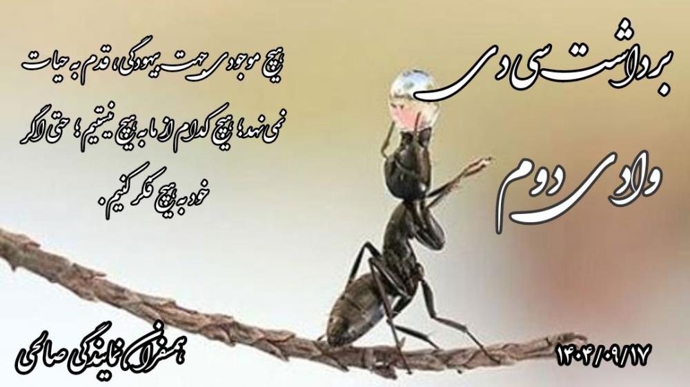 یادداشت رسالت انسان در جهان هستی 17 آذر هسفر مریم برداشت خود را از سیدی «وادی دوم» اینگونه بیان کرد: انسان برای هدفی والا، مقدس و ارزشمند پا به عرصه حیات نهاده است.