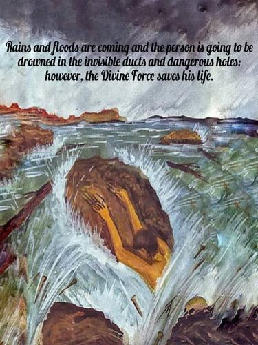 Weekly Images The 11th Image of the Book: “Crossing the Zone Minus 60̊ Centigrade” 18 Dec 2021 Rains and floods are coming and the person is going to be drowned in the invisible ducts and dangerous hole; however, the Divine Force saves his life.